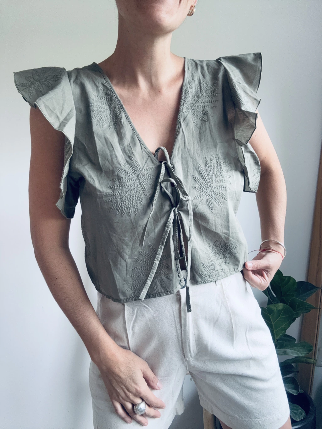 Blusa con volados y lazos delanteros: un toque femenino y delicado para tu guardarropa. Confeccionada en tela suave y liviana, esta blusa destaca por sus volados que aportan movimiento y los lazos delanteros que realzan el diseño.